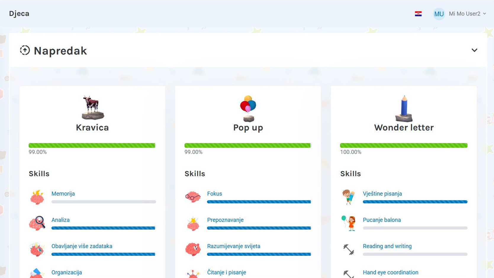 Možete pratiti napredak svoje djece u svakoj mini igri, kao i vještine koje razvijaju. Ovo vam pruža jasan uvid u njihov rast i uspjeh u različitim izazovima.